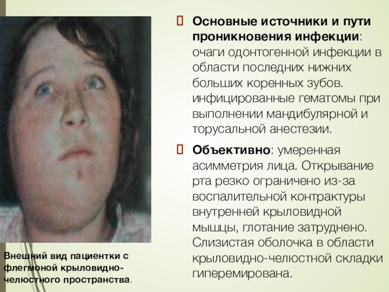 Внешний вид пациентки с флегмоной крыловидно-челюстного пространства.
