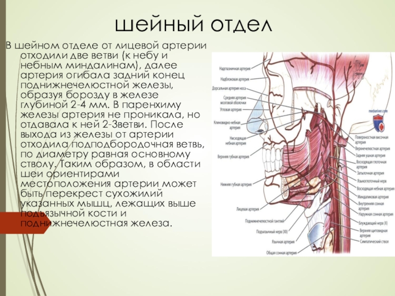железы, образуя борозду в железе глубиной 2-4 мм. В паренхиму железы артерия не проникала, но отдавала к ней 2-3ветви. После выхода из железы от артерии отходила подподбородочная ветвь, по диаметру равная основному стволу. Таким образом, в области шеи ориентирами местоположения артерии может быть перекрест сухожилий указанных мышц, лежащих выше подъязычной кости и поднижнечелюстная железа.