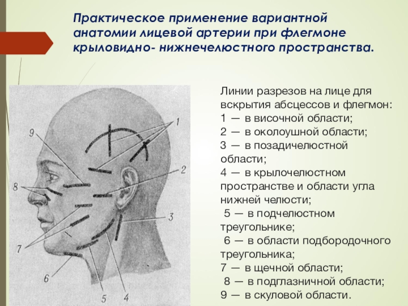 Слайд 32Практическое применение вариантной анатомии лицевой артерии при флегмоне крыловидно- нижнечелюстного
