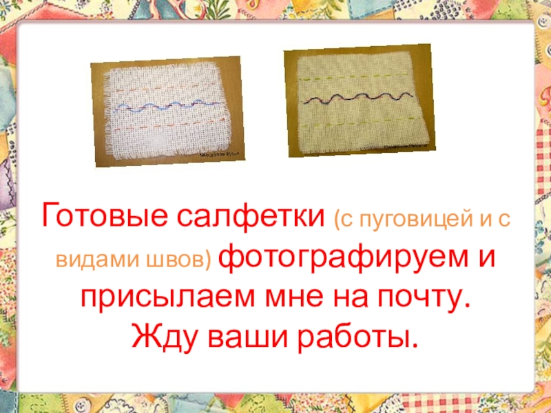 Слайд 24 Готовые салфетки (с пуговицей и с видами швов) фотографируем и