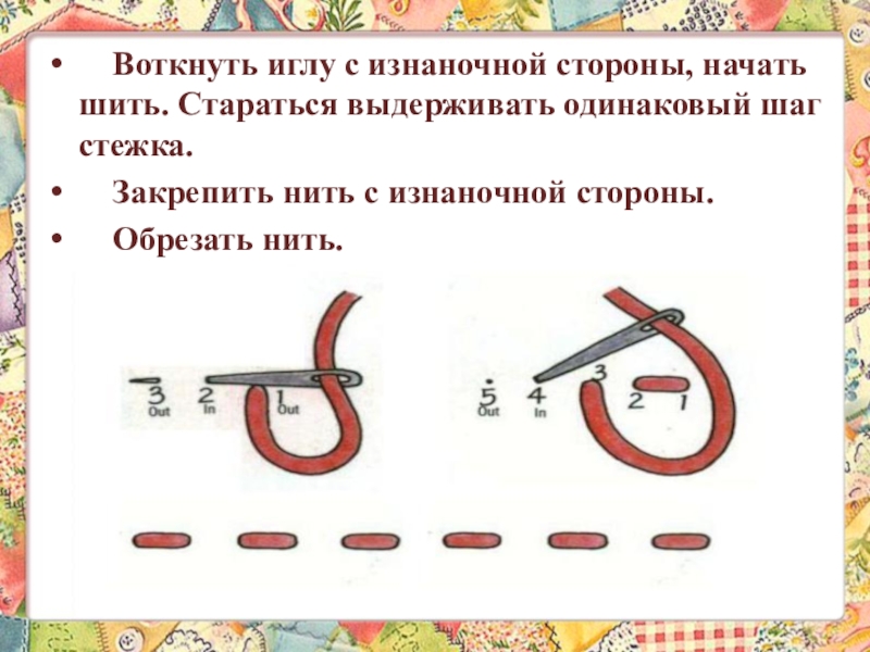 Слайд 18 Воткнуть иглу с изнаночной стороны, начать шить. Стараться