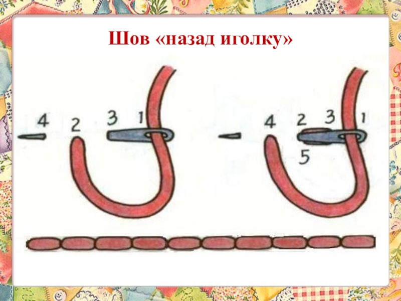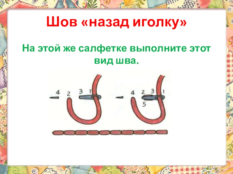 Шов «назад иголку»На этой же салфетке выполните этот      вид шва.
