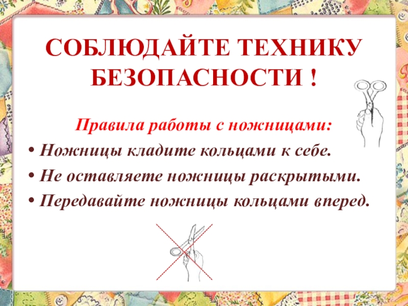 СОБЛЮДАЙТЕ ТЕХНИКУ БЕЗОПАСНОСТИ !Правила работы с ножницами:Ножницы кладите кольцами к себе. Не оставляете ножницы раскрытыми. Передавайте ножницы