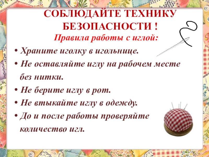 СОБЛЮДАЙТЕ ТЕХНИКУ БЕЗОПАСНОСТИ ! Правила работы с иглой:Храните иголку в игольнице. Не оставляйте иглу на рабочем месте