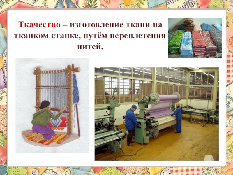 Слайд 5 Ткачество – изготовление ткани на ткацком станке, путём
