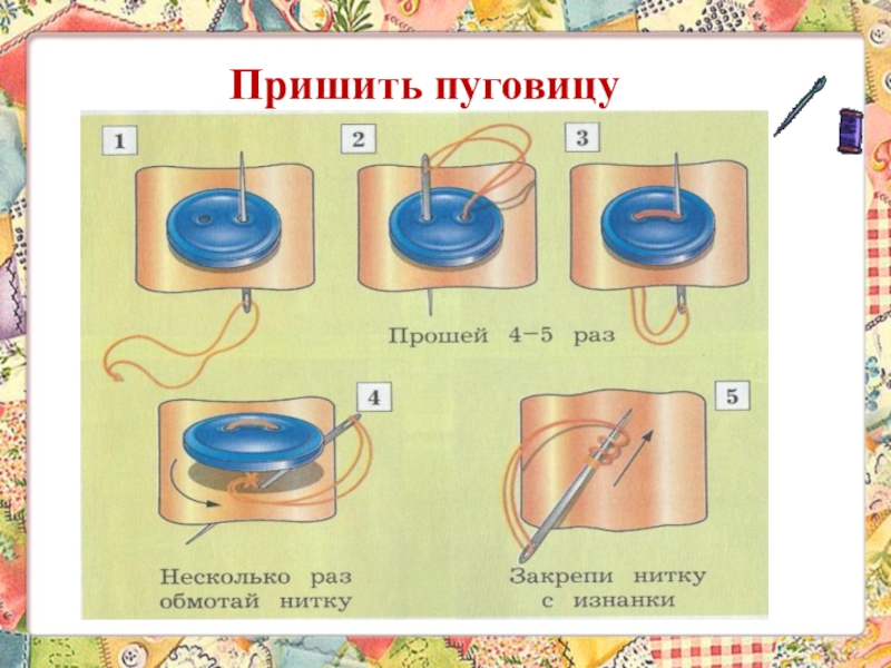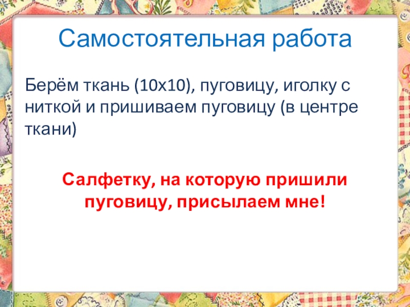 Самостоятельная работаБерём ткань (10х10), пуговицу, иголку с ниткой и пришиваем пуговицу (в центре ткани)Салфетку, на которую пришили