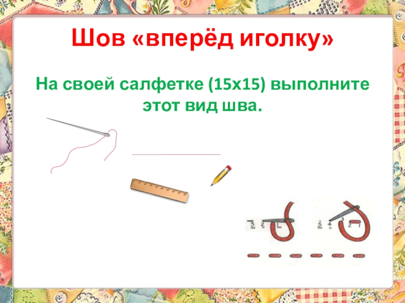 Шов «вперёд иголку»На своей салфетке (15х15) выполните этот вид шва.