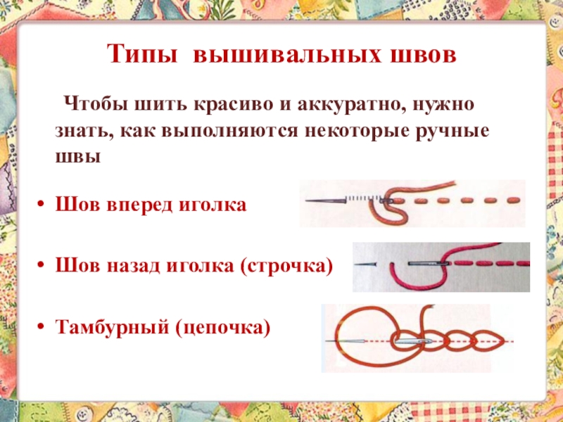 Типы вышивальных швов   Чтобы шить красиво и аккуратно, нужно знать, как выполняются некоторые ручные швыШов