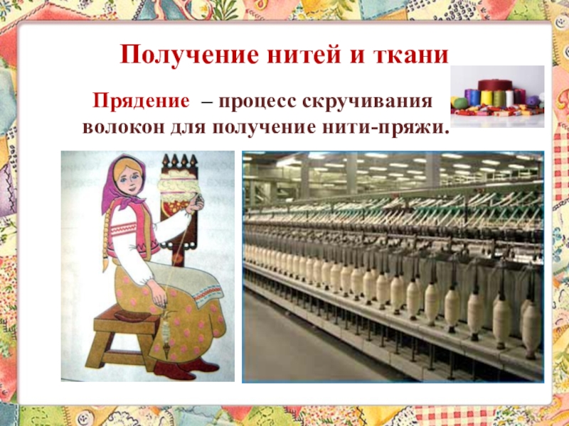 Получение нитей и ткани  Прядение – процесс скручивания волокон для получение нити-пряжи.
