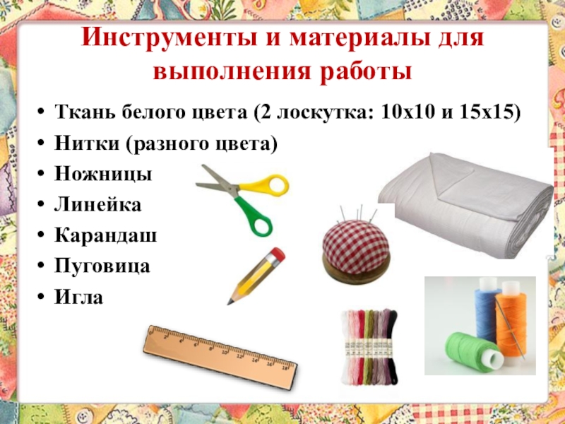Инструменты и материалы для выполнения работыТкань белого цвета (2 лоскутка: 10х10 и 15х15) Нитки (разного цвета)Ножницы Линейка