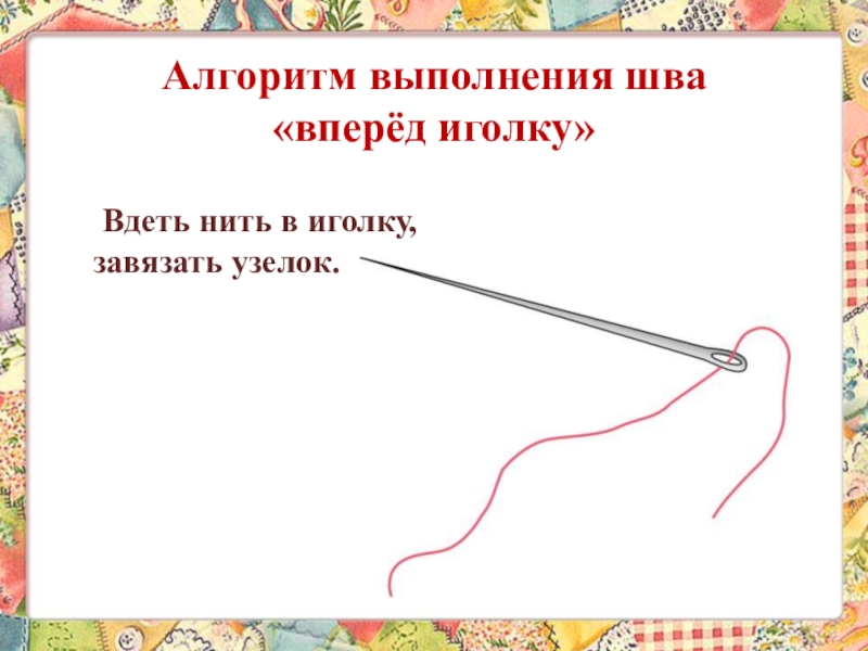 Алгоритм выполнения шва  «вперёд иголку»   Вдеть нить в иголку,  завязать узелок.