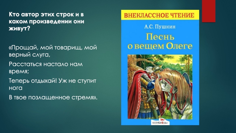 Кто автор этих строк и в каком произведении они живут?«Прощай, мой товарищ, мой верный слуга,Расстаться настало нам