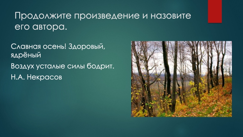 Продолжите произведение и назовите его автора.Славная осень! Здоровый, ядрёныйВоздух усталые силы бодрит.Н.А. Некрасов