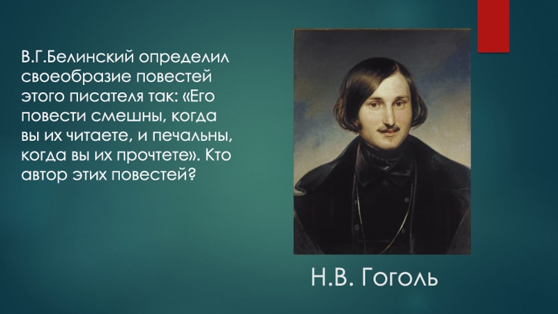 Н.В. ГогольВ.Г.Белинский определил своеобразие повестей этого писателя так: «Его повести смешны, когда вы их читаете, и печальны,