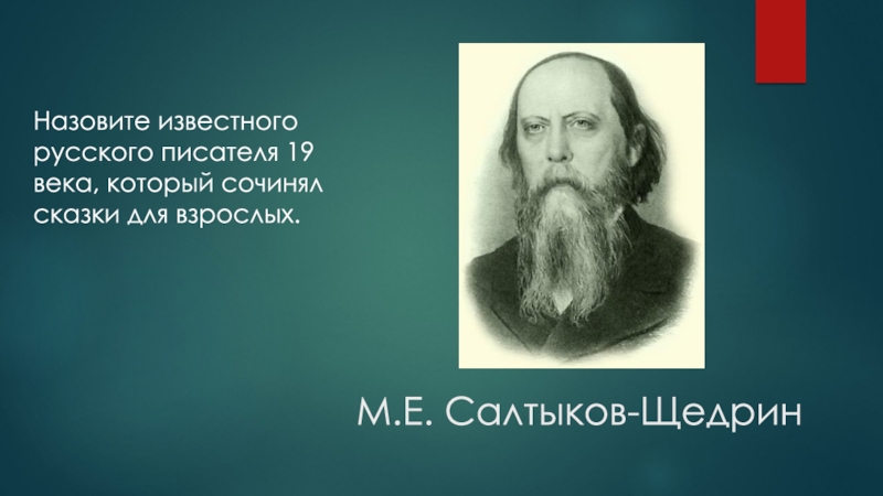 М.Е. Салтыков-ЩедринНазовите известного русского писателя 19 века, который сочинял сказки для взрослых.