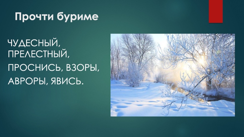Прочти буримеЧУДЕСНЫЙ, ПРЕЛЕСТНЫЙ,ПРОСНИСЬ, ВЗОРЫ,АВРОРЫ, ЯВИСЬ.