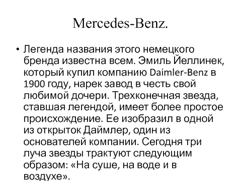 свой любимой дочери. Трехконечная звезда, ставшая легендой, имеет более простое происхождение. Ее изобразил в одной из открыток Даймлер, один из основателей компании. Сегодня три луча звезды трактуют следующим образом: «На суше, на воде и в воздухе».
