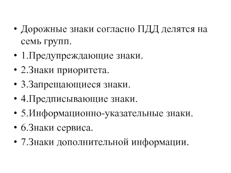 Слайд 4Дорожные знаки согласно ПДД делятся на семь групп.
