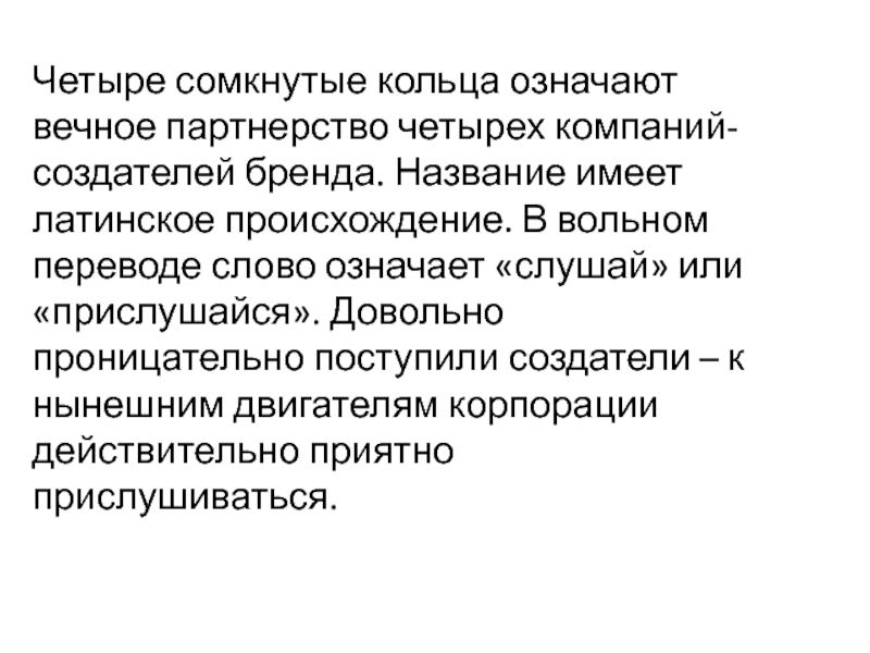 Слайд 83Четыре сомкнутые кольца означают вечное партнерство четырех компаний-создателей бренда. Название