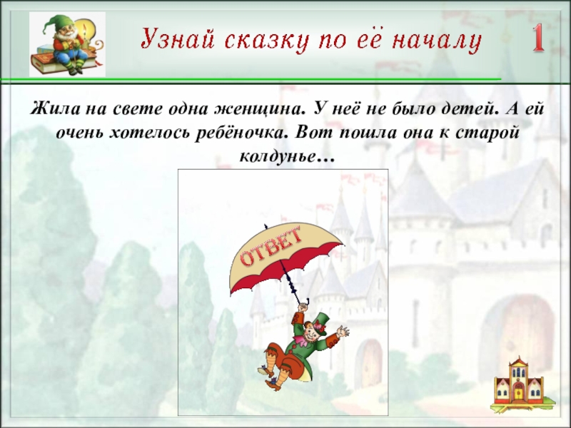 Жила на свете одна женщина. У неё не было детей. А ей очень хотелось ребёночка. Вот пошла