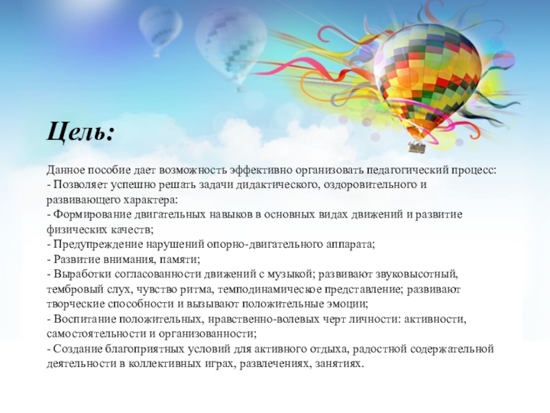 Цель: Данное пособие дает возможность эффективно организовать педагогический процесс: - Позволяет успешно решать задачи дидактического, оздоровительного и развивающего характера: - Формирование двигательных навыков в основных видах движений и развитие