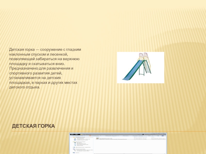 детская горка Детская горка — сооружение с гладким наклонным спуском и лесенкой, позволяющей забираться на верхнюю площадку