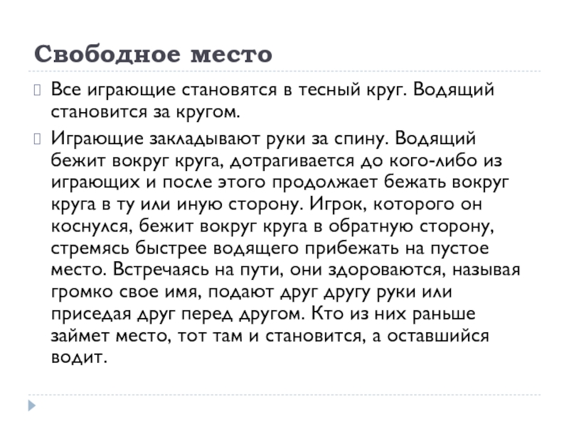 Свободное местоВсе играющие становятся в тесный круг. Водящий становится за кругом.Играющие закладывают руки за спину. Водящий бежит