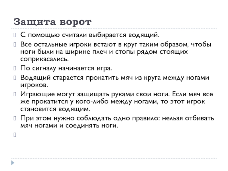 Защита воротС помощью считали выбирается водящий.Все остальные игроки встают в круг таким образом, чтобы ноги были на