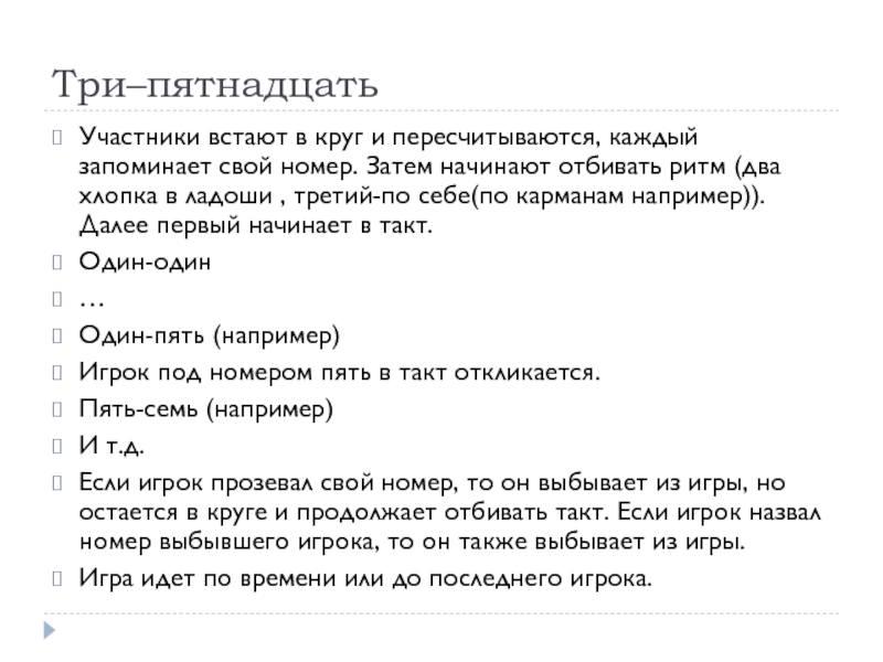 Три–пятнадцатьУчастники встают в круг и пересчитываются, каждый запоминает свой номер. Затем начинают отбивать ритм (два хлопка в