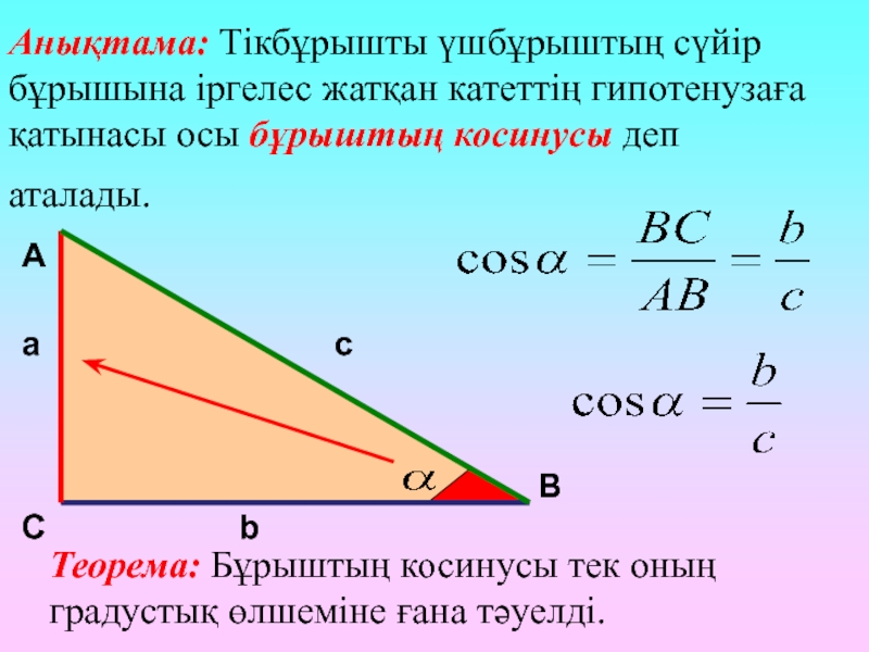 АСВbcaАнықтама: Тікбұрышты үшбұрыштың сүйір бұрышына іргелес жатқан катеттің гипотенузаға қатынасы осы бұрыштың косинусы депаталады. Теорема: Бұрыштың косинусы