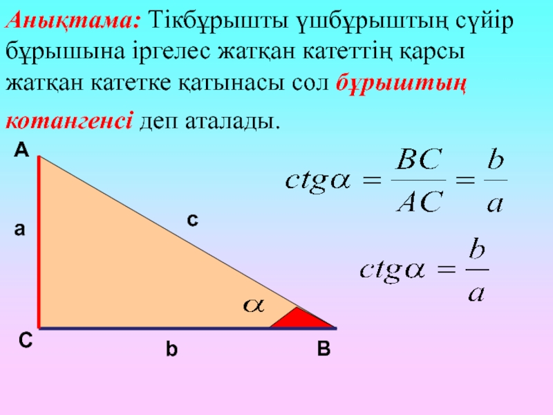 АСВbcaАнықтама: Тікбұрышты үшбұрыштың сүйір бұрышына іргелес жатқан катеттің қарсы жатқан катетке қатынасы сол бұрыштың котангенсі деп аталады.