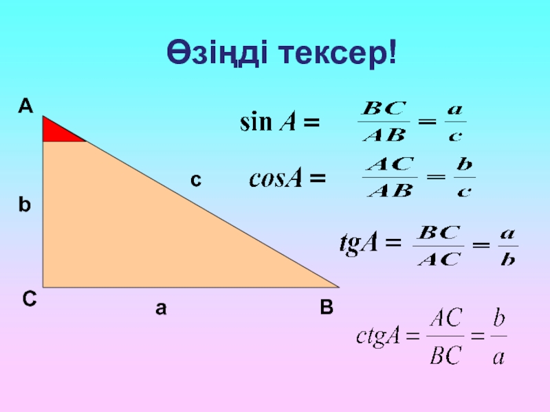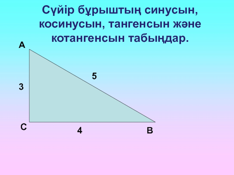 Слайд 11Сүйір бұрыштың синусын, косинусын, тангенсын және котангенсын табыңдар.