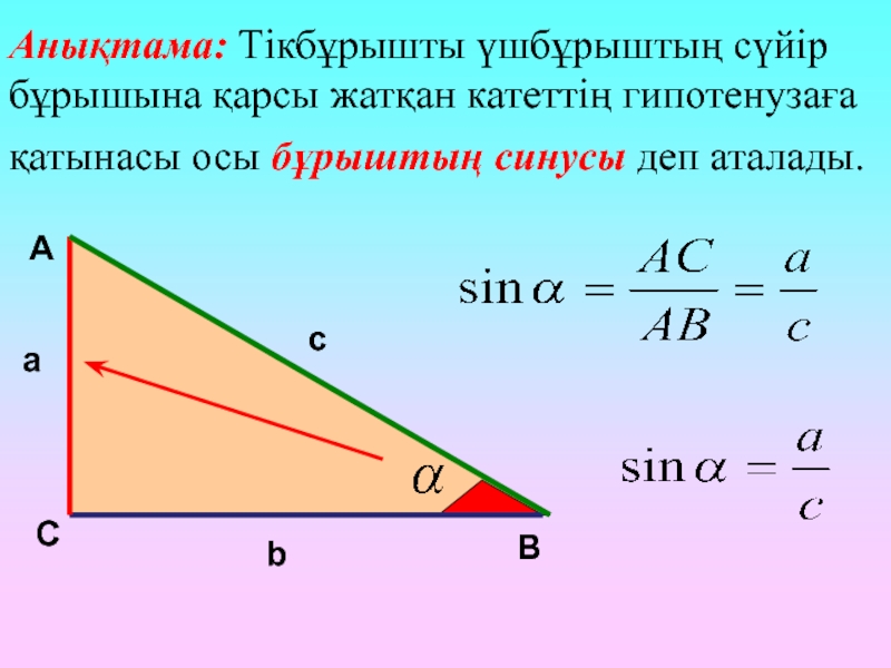 АСВbcaАнықтама: Тікбұрышты үшбұрыштың сүйір бұрышына қарсы жатқан катеттің гипотенузаға қатынасы осы бұрыштың синусы деп аталады.