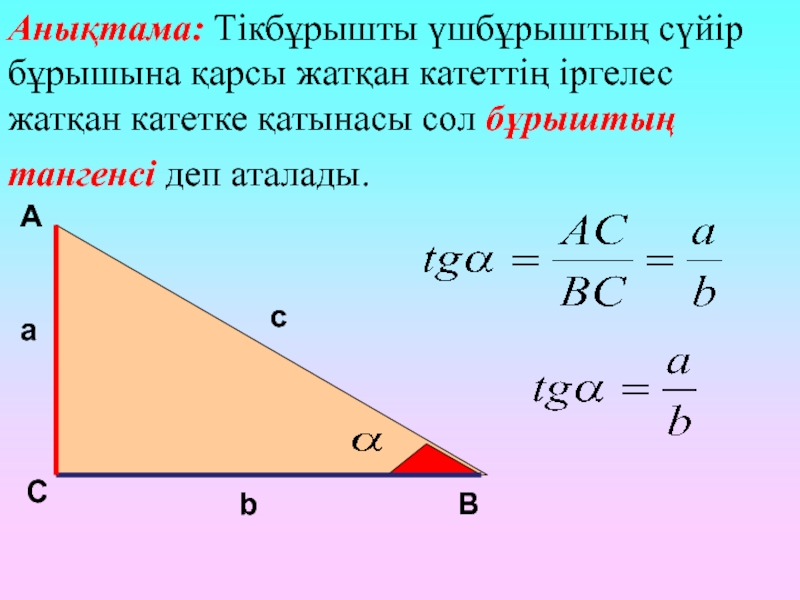 АСВbcaАнықтама: Тікбұрышты үшбұрыштың сүйір бұрышына қарсы жатқан катеттің іргелес жатқан катетке қатынасы сол бұрыштың тангенсі деп аталады.