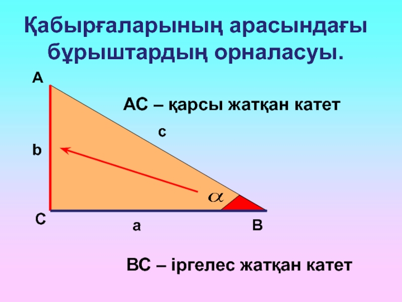 АСВbcaАС – қарсы жатқан катетВС – іргелес жатқан катетҚабырғаларының арасындағы бұрыштардың орналасуы.