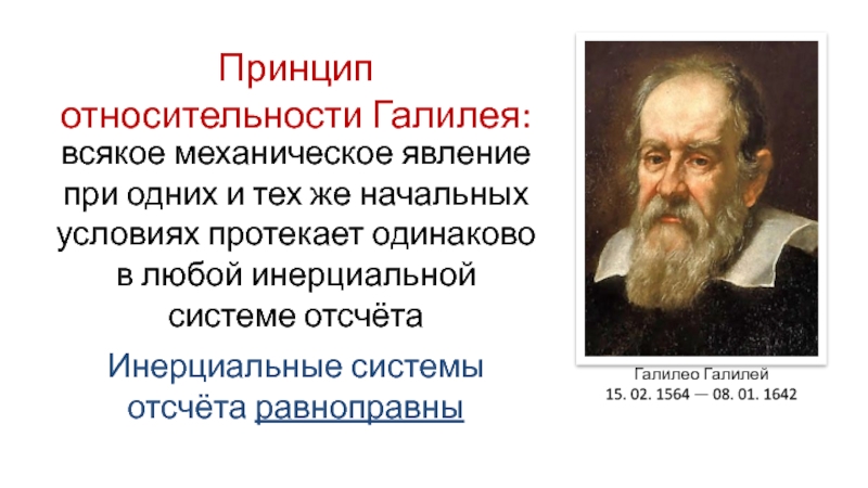 Принцип относительности Галилея: всякое механическое явление при одних и тех же начальных условиях протекает одинаково в любой инерциальной системе отсчёта