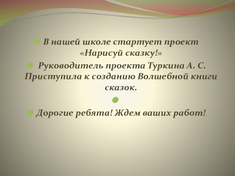 Слайд 2В нашей школе стартует проект «Нарисуй сказку!» Руководитель проекта Туркина