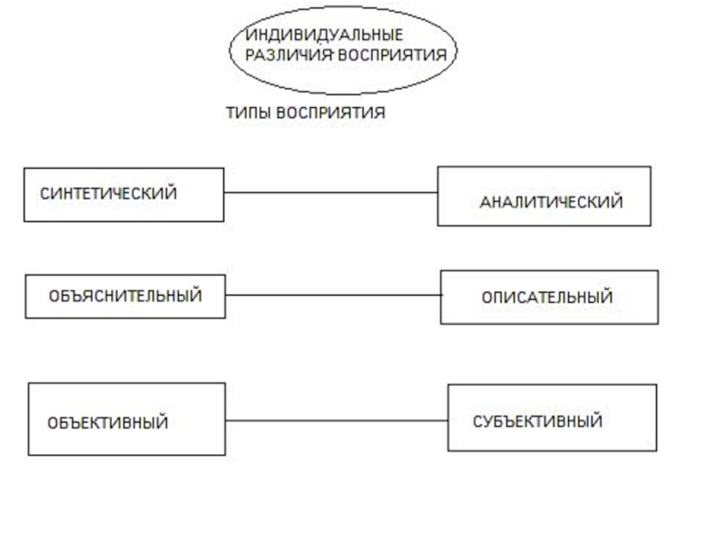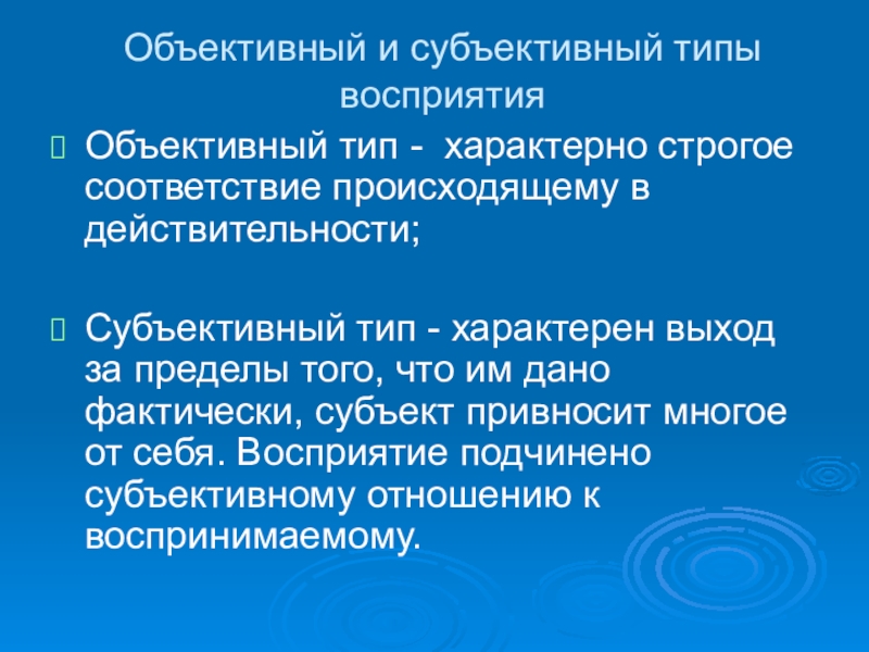 Объективный и субъективный типы восприятияОбъективный тип - характерно строгое соответствие происходящему в действительности;Субъективный тип - характерен выход