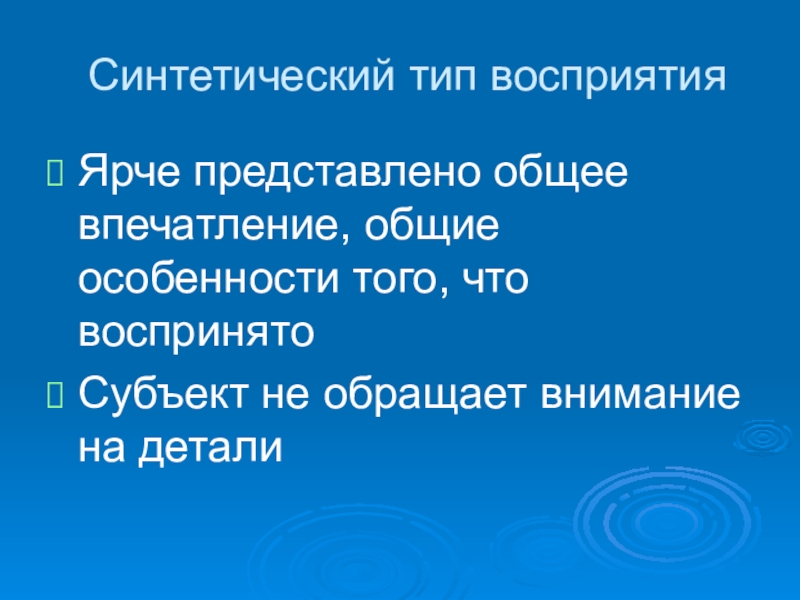 Синтетический тип восприятияЯрче представлено общее впечатление, общие особенности того, что воспринятоСубъект не обращает внимание на детали