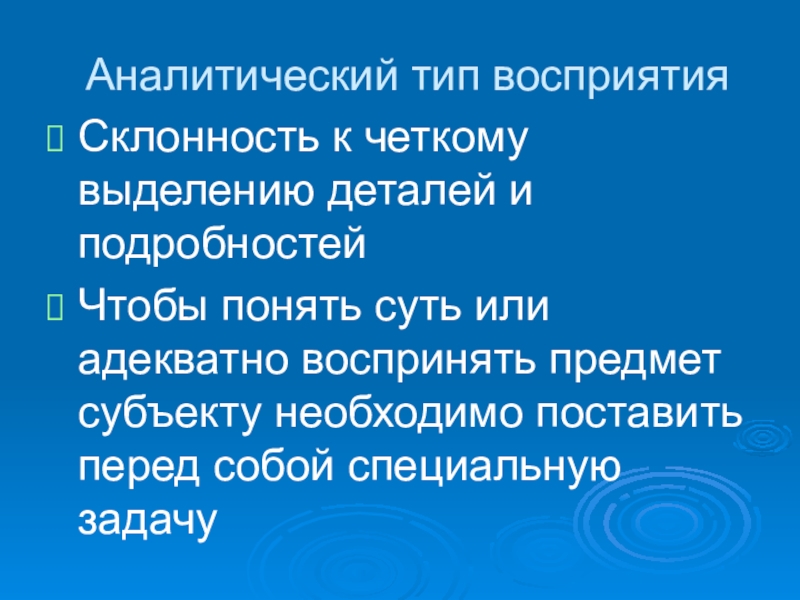 Аналитический тип восприятияСклонность к четкому выделению деталей и подробностейЧтобы понять суть или адекватно воспринять предмет субъекту необходимо