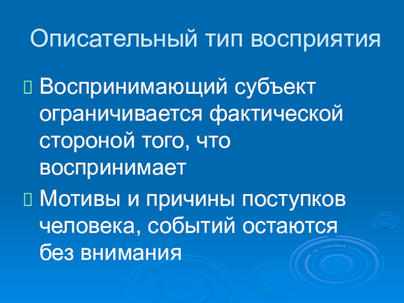 Описательный тип восприятияВоспринимающий субъект ограничивается фактической стороной того, что воспринимаетМотивы и причины поступков человека, событий остаются без