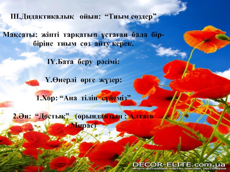 Мақсаты: Балалардың өмірге қажетті білік дағдыларын тереңдете отырып, ұлттық салт-дәстүрге баулу,сәлемдесу,қонақ күту,сыйластық,үлкенге құрмет көрсету,бата беру рәсімі түрлерін меңгерту. Имандылыққа , инабаттылыққа тәрбиелеу.