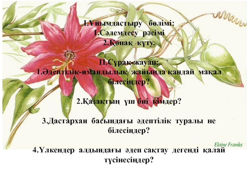 тереңдете отырып, ұлттық салт-дәстүрге баулу,сәлемдесу,қонақ күту,сыйластық,үлкенге құрмет көрсету,бата беру рәсімі