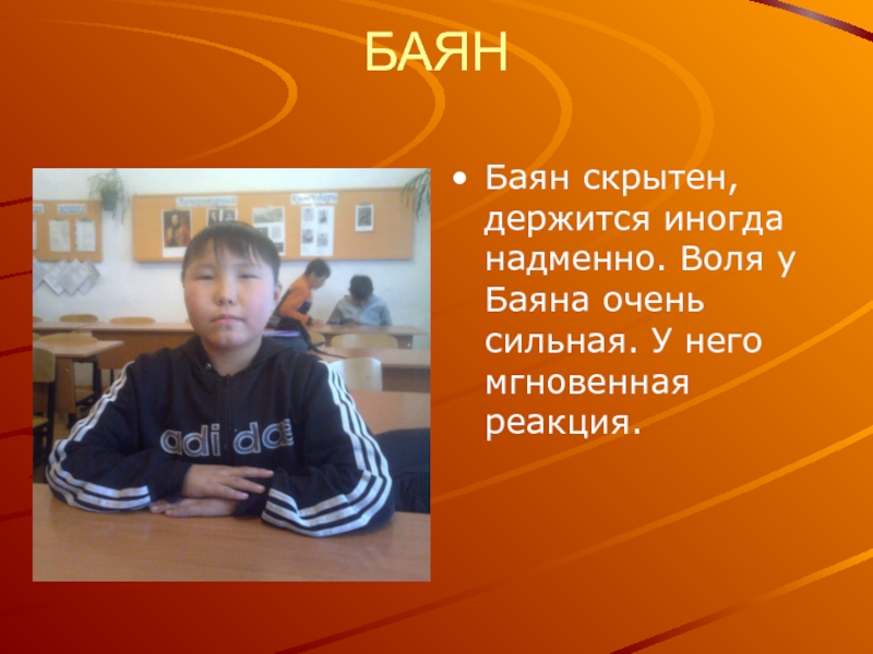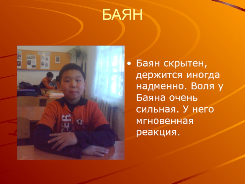 Баян скрытен, держится иногда надменно. Воля у Баяна очень сильная.