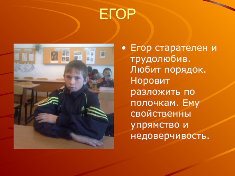 Егор старателен и трудолюбив. Любит порядок. Норовит разложить по полочкам.