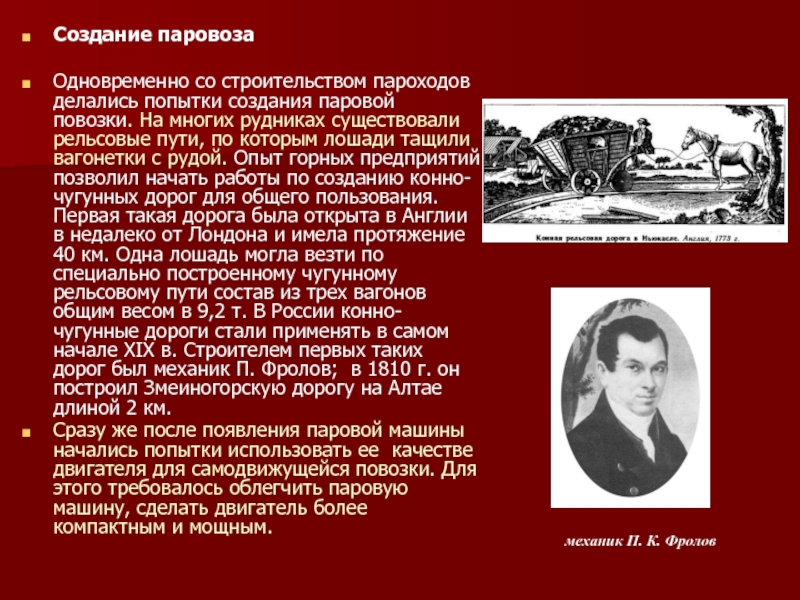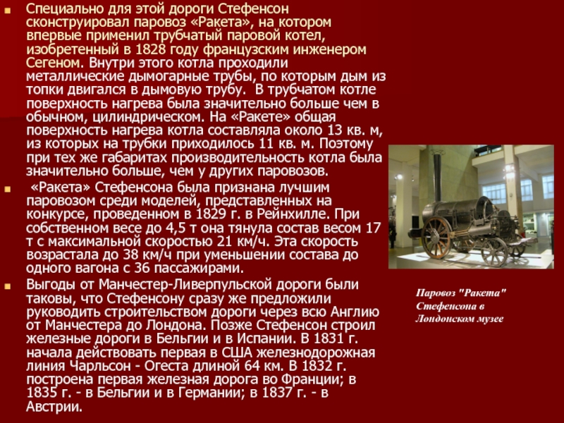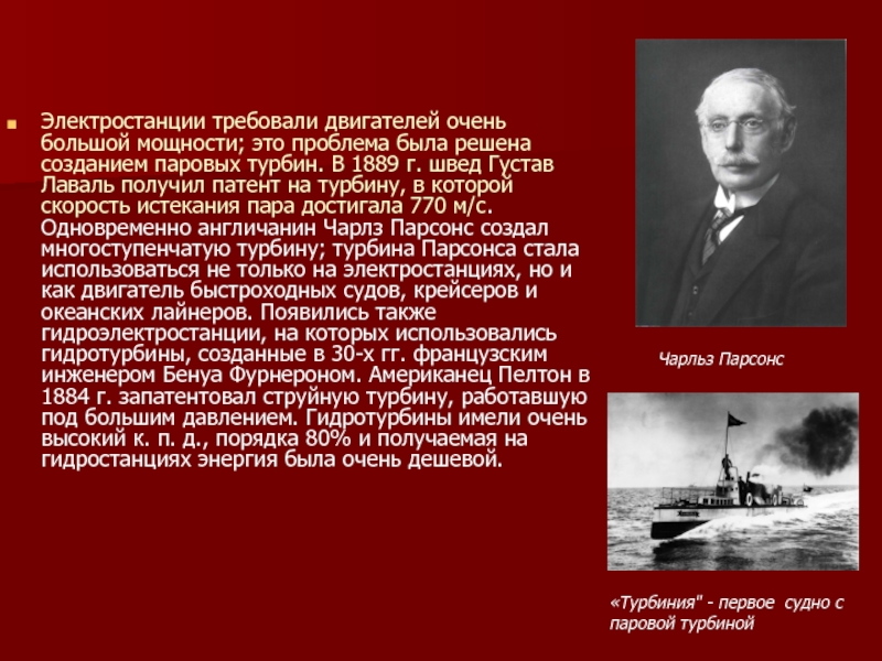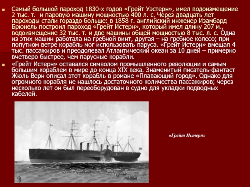 России пароходов» - однако в через год Фултон скончался, так и не собравшись в дорогу. Привелегия перешла к шотландскому промышленнику Чарльзу Берду, который в 1815 г. построил на своем заводе первый росийский пароход «Елизавета». 3 ноября 1815 г. он открыл регулярные рейсы между Петербургом и Кронштадтом, развивая скорость 9,5 км/ч.В 1819 г. американский пароход «Саванна» за 26 дней пересек Атлантический океан, а в 1830 г. начинает действовать первая регулярная трансатлантическая пароходная линия. В 1822 г. было построено металлическое паровое судно («Аарон Мэнби»), совершавшее рейсы из Лондона в Гавр. В 1830-х годах вместо гребных колес начинает использоваться гребной винт; в 1843 г. винтовой пароход «Грейтбритн» переплыл Атлантику. Гребной винт оказался гораздо экономичнее по сравнению с гребным колесом, которое постоянно работало в различных режимах, связанных с разным уровнем его погружения в воду.