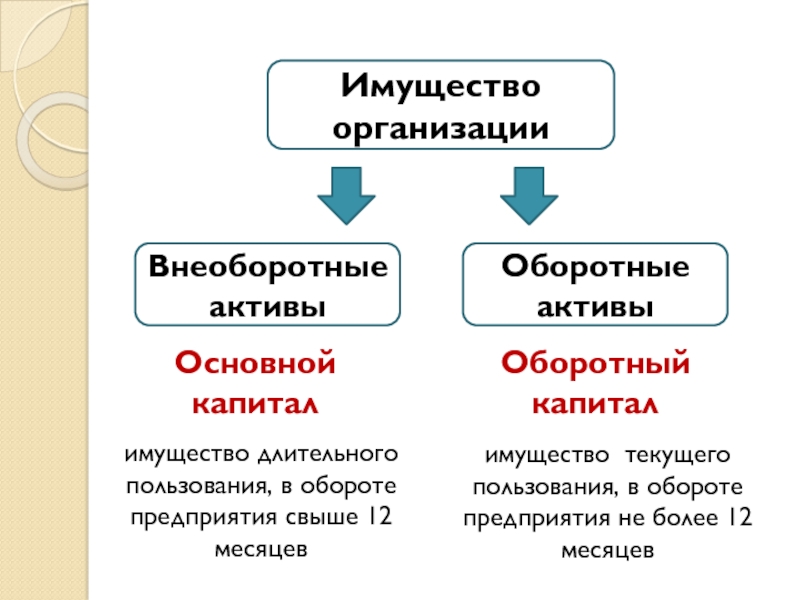 Имущество организацииВнеоборотные активыОборотные активыОсновной капиталОборотный капиталимущество длительного пользования, в обороте предприятия свыше 12 месяцевимущество текущего пользования, в обороте предприятия не более 12 месяцев