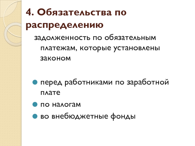 4. Обязательства по распределению задолженность по обязательным платежам, которые установлены закономперед работниками по заработной платепо налогамво внебюджетные