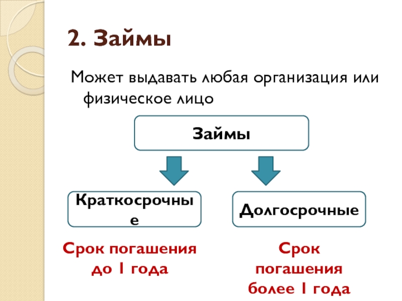 2. ЗаймыМожет выдавать любая организация или физическое лицоЗаймыКраткосрочныеДолгосрочныеСрок погашения до 1 годаСрок погашения более 1 года