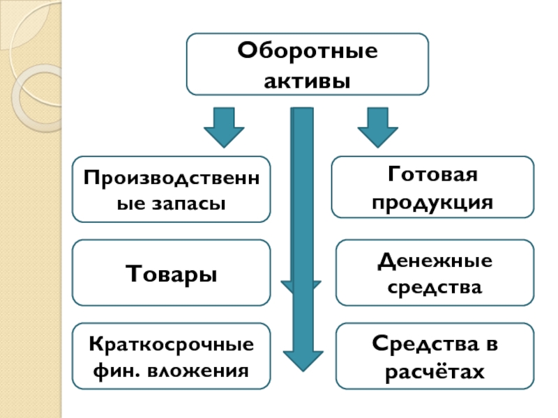 Оборотные активыПроизводственные запасыГотовая продукцияТоварыДенежные средстваКраткосрочные фин. вложенияСредства в расчётах